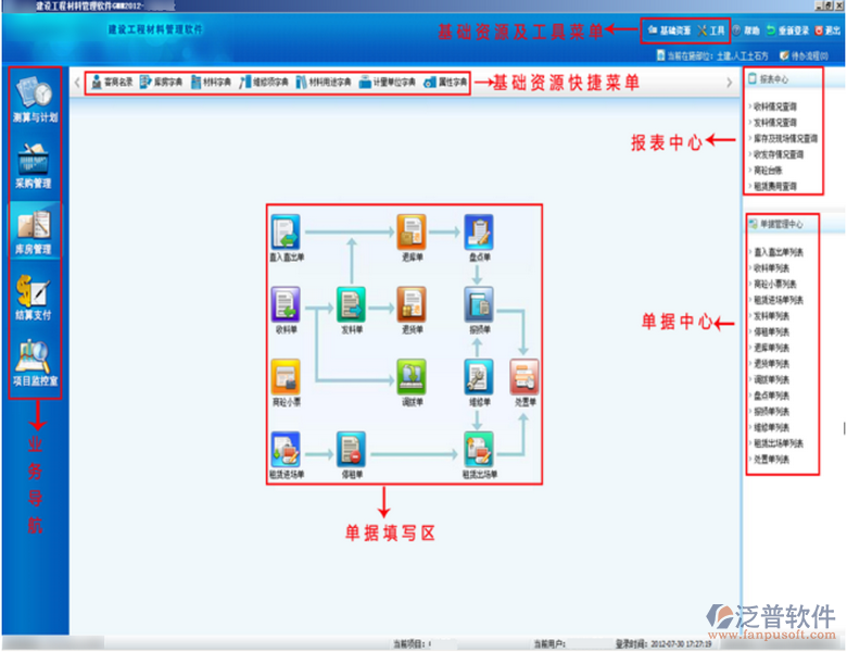 泛普軟件-建筑工程材料管理軟件加強(qiáng)對材料的管理,是施工企業(yè)經(jīng)營管理重要工作之一,也是成本控制的一項(xiàng)重要內(nèi)容。材料管理目標(biāo)概況為:按時(shí)、按質(zhì)、按量保證工程施工的材料供給,即按照工程施工計(jì)劃進(jìn)度供應(yīng)物資,既不超量采購導(dǎo)致過度占用流動資金,也不因采購不足而造成停工待料,并保持合理庫存。做到需求有計(jì)劃,采購按計(jì)劃,供給有保障,資金不占用。根據(jù)公司需要,在材料管理界面中可設(shè)立多個(gè)不同位置的倉庫,使您在千里之外,也可詳細(xì)了解各個(gè)分公司下有多少項(xiàng)目,每個(gè)項(xiàng)目的材料使用情況,下面為材料管理軟件主界面介紹: