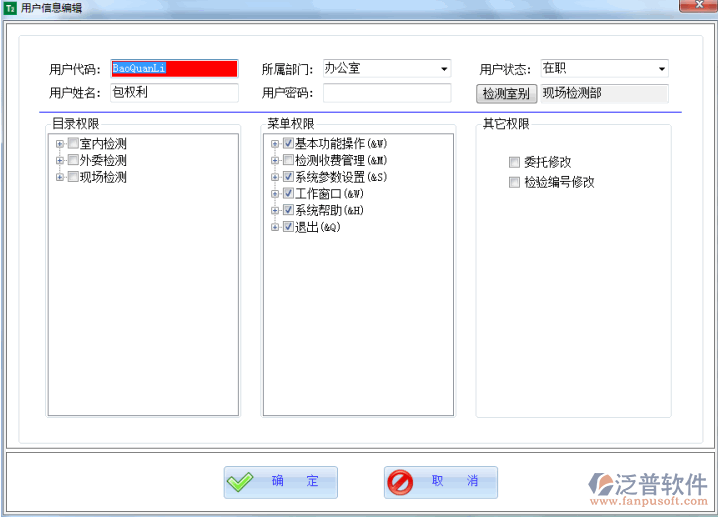 首先設(shè)置 用戶編號(hào)、用戶名稱、所屬部門、用戶密碼,輸入完成后,再設(shè)置菜單權(quán)限,菜單權(quán)限鉤選復(fù)選框表示有該權(quán)限。目錄功能權(quán)限同菜單權(quán)限設(shè)置方法相同。