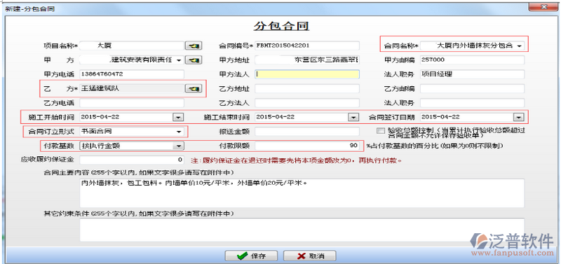 選中[泛普大廈]項(xiàng)目點(diǎn)擊【新建】來(lái)建立一個(gè)合同,界面如下: