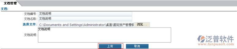 進入文檔添加菜單后,完善文檔信息,點擊【上傳】按鈕上傳該文檔,點擊【取消】不上傳文檔并且返回列表頁面。