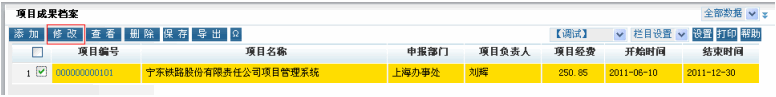 保存了數據之后在表單中可以看到所添加的項目成果檔案信息,點擊【修改】按扭以對項目成果檔案進行修改。