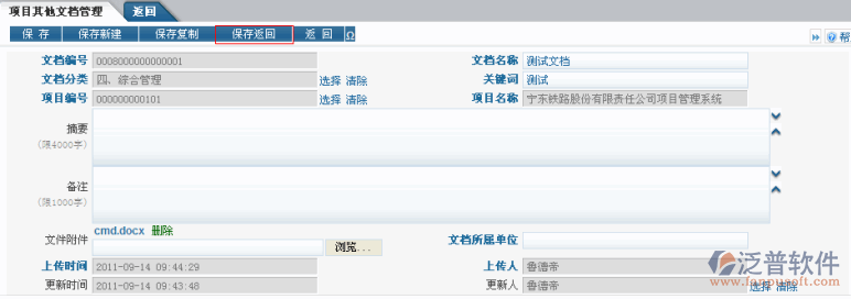 保存了數(shù)據(jù)之后在表單中可以看到所添加的項目文檔信息,點擊【修改】按扭以對項目文檔信息進行修改。
