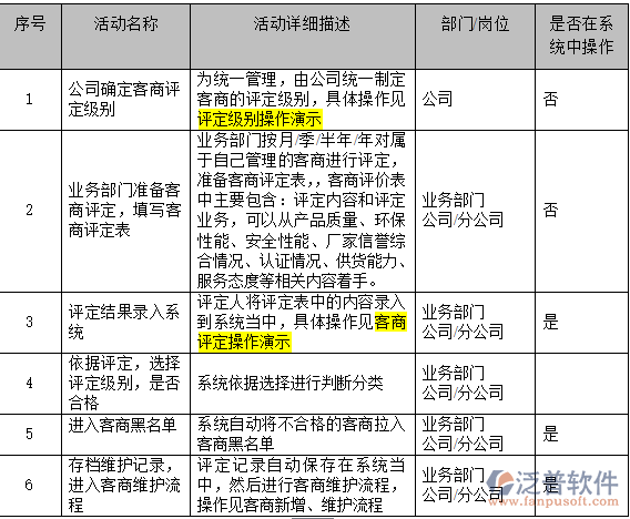 客商信息在合作的過(guò)程中,需要按月/季/半年/年一定頻率作評(píng)價(jià),要將一定期限內(nèi)不合作的客商從合格分供商名錄中分開(kāi),拉入黑名單,在公司內(nèi)進(jìn)行公布示眾。同時(shí),需要在系統(tǒng)中修改客商信譽(yù),始終將最新的合格客商名單提供給需要的各業(yè)務(wù)部門進(jìn)行查閱使用。