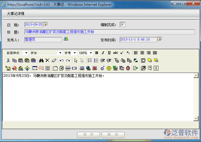 點(diǎn)擊【增加】按鈕或雙擊記錄,大事記記錄打開如如下圖,編輯大事記內(nèi)容界面,維護(hù)定義編號,標(biāo)題,保留時間,內(nèi)容等基本信息,點(diǎn)擊【確定】按鈕完成大事記維護(hù)操作;