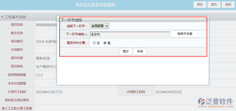 3、 如果選擇‘是’表示需要發(fā)起合同,點擊提交按鈕選擇合同起草人。