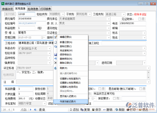 委托界面中鼠標右鍵單擊,彈出圖5菜單,點擊“編輯記錄”,可以看到界面中當前委托信息由鎖定(不可編輯)狀態(tài)變?yōu)榭删庉嫚顟B(tài)(圖6),用戶直接在該界面修改即可。修改完成后單擊底部工具欄“保存”按鈕,完成本次修改操作。