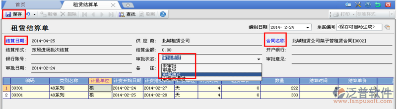 編輯:第一步:將主表信息進(jìn)行輸入(藍(lán)色字體必填)如“結(jié)算日期”和“合同名稱”,確認(rèn)無誤之后將審批狀態(tài)修改為“審批通過”點(diǎn)擊【保存】就可完成租賃結(jié)算的錄入工作