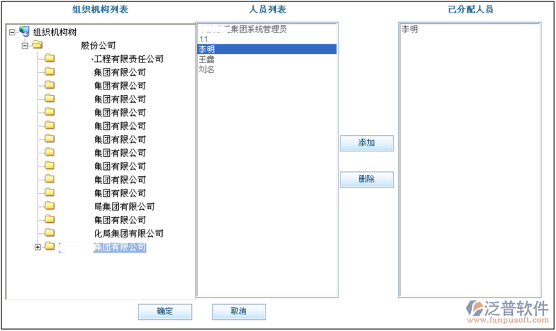 選中組織機(jī)構(gòu),選中該節(jié)點(diǎn)的審批人員,點(diǎn)擊“添加”,選擇完畢點(diǎn)擊“確定”。
