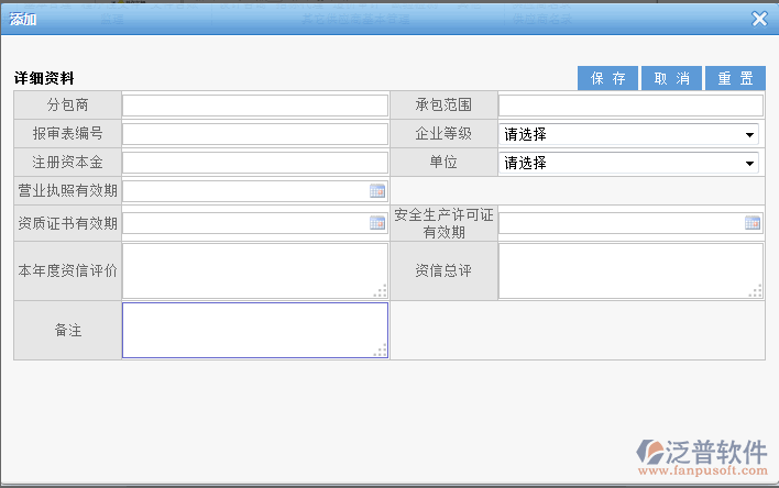 在【分包商】頁面,選中左側項目,右側選中一行供應商,右下表中列出對應工應商的【分包商】,分包商頁面點擊【添加】按鈕,彈出如下窗口: