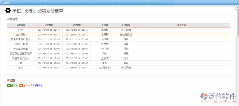 在【文件臺賬】頁面,選中一條報審的文件記錄,點擊【審批進度】按鈕,查看整個文件報審的流程明細信息,如下圖所示: