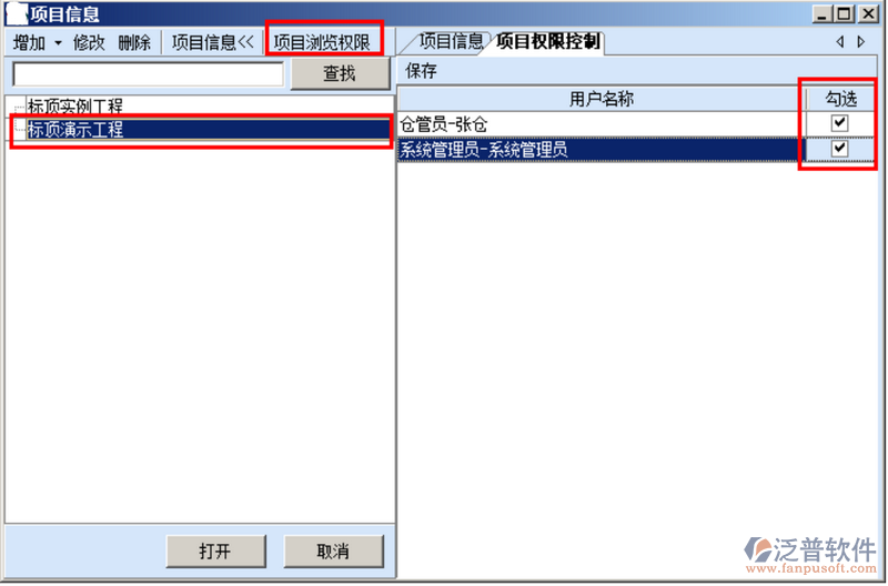 “項(xiàng)目信息管理”打開“打開項(xiàng)目信息”彈出來的項(xiàng)目信息窗口左邊是工程項(xiàng)目,右邊顯示工程詳細(xì)信息、項(xiàng)目權(quán)限控制,選擇某一工程可以對(duì)詳細(xì)信息進(jìn)行修改,刪除。也可以通過項(xiàng)目權(quán)限控制編輯此項(xiàng)目的操作權(quán)限(系統(tǒng)默認(rèn)新建的工程所有操作員都有權(quán)限,如對(duì)其中的部分操作員進(jìn)行勾選,那么其他的操作員進(jìn)入系統(tǒng)就無法看到此項(xiàng)目也無法擁有此項(xiàng)目操作權(quán))。