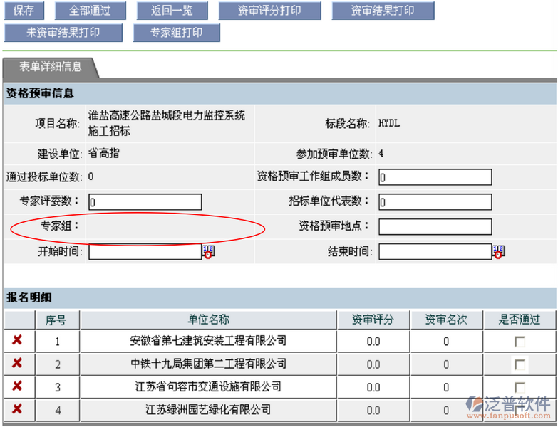 Ø 從項目流程控制菜單進入,在資審報名環(huán)節(jié)中通過的投標單位,將會進入到資格預審環(huán)節(jié)。此時單擊橢圓形按鈕進入資格預審編輯頁面,單擊“保存”按鈕,此時由菜單“項目流程管理”——》“資格預審流程”進入資審報名流程管理界面,才能檢索查看到資格預審的結果。