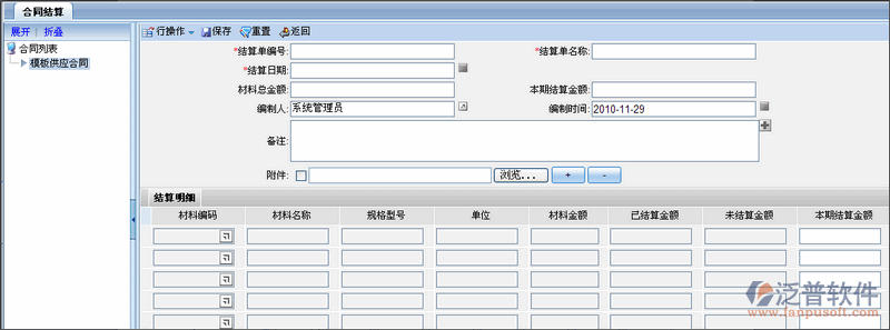 填寫對應(yīng)的結(jié)算單編號、名稱、結(jié)算日期,選在材料編碼,系統(tǒng)會(huì)自動(dòng)篩選出對應(yīng)合同下的合同清單,進(jìn)行選擇進(jìn)來,并填入本期結(jié)算金額即可。