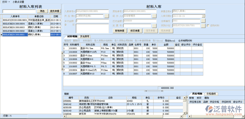“材料應(yīng)用管理”下“材料入庫單”,彈出材料入庫窗口,點(diǎn)擊“新增單據(jù)”新增單據(jù),入庫單編號由系統(tǒng)自動生成,輸入單據(jù)名稱,選擇供應(yīng)商、經(jīng)辦人等其他信息,再在下面的表單中輸入材料(材料可以通過兩種方式選擇:1在表中輸入材料的編號或者材料名稱,軟件會自動搜索相關(guān)的材料在下面材料庫表中顯示,再雙擊材料就可以把材料選擇上去2點(diǎn)擊上面的材料指引或者材料編號和材料名稱后面的小按鈕可以打開材料庫,在材料庫分類中雙擊選擇材料就可將所選材料選入預(yù)算計劃表中)輸入數(shù)量和單價(其中品牌可以輸入也可以不輸入,表頭有默認(rèn)倉庫,如果表中有些材料單獨(dú)存放于其他倉庫那么可以在此記錄的倉庫號列中選擇倉庫。綜合評價列系統(tǒng)有默認(rèn)7種情況,根據(jù)供應(yīng)商提供的材料品質(zhì)選擇相關(guān)評價,在下次做采購或者入庫的時候系統(tǒng)會給予歷史評價和單價做參考是否繼續(xù)采購此供應(yīng)商的此材料),表單中分兩頁材料明細(xì)(錄入入庫材料明細(xì))和其他費(fèi)用(輸入運(yùn)費(fèi)及其他附加費(fèi)用),點(diǎn)擊保存單據(jù)就將此單據(jù)保存成功了,保存成功后的單據(jù)會再左邊的預(yù)算計劃列表中顯示出來,方便查看(雙擊單據(jù),會在右邊表中顯示此單據(jù)的詳細(xì)情況,可以修改保存此單據(jù))