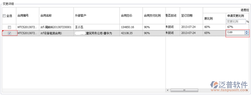 注意:如果所有的合同的變更比例均需統(tǒng)一調(diào)整,則把全選打鉤,再調(diào)整變更比例。