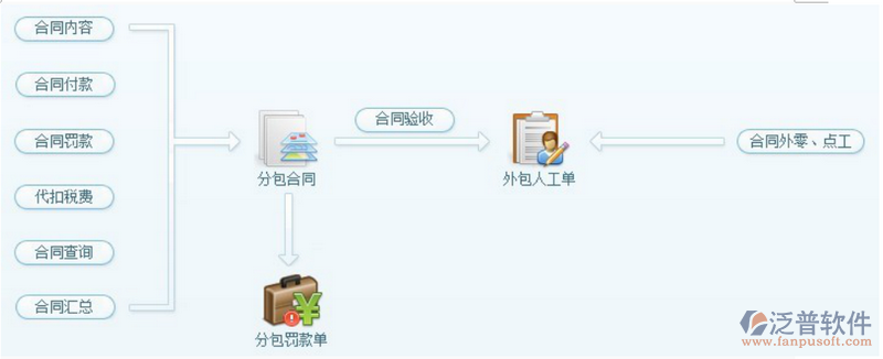 3. 【分包費(fèi)】可用于統(tǒng)計(jì)專(zhuān)業(yè)分包產(chǎn)生的成本及臨時(shí)雇用的零工成本。如軟件流程圖所示:分包成本是由外包人工單產(chǎn)成,其來(lái)源可分為兩部分,第一:來(lái)自分包合同中的合同驗(yàn)收,第二:來(lái)自合同外零、點(diǎn)工驗(yàn)收。
