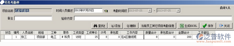 在勞務(wù)考勤中,記錄的內(nèi)容主要包括:當(dāng)前日期的出勤情況、工作內(nèi)容。如下圖所示:?jiǎn)T工張三在7月25日,考勤數(shù)為8,工作內(nèi)容為,在A區(qū)接線纜。他的工資類(lèi)型屬于計(jì)時(shí),所以8代表8小時(shí),他當(dāng)天的工資為:25乘以8=200。除正常的考勤外還有承包款一項(xiàng),一般是記錄員工當(dāng)天的補(bǔ)助或加班費(fèi)等。