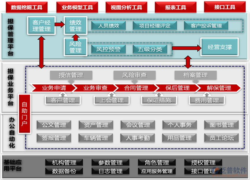 泛普軟件的擔(dān)保業(yè)務(wù)運營支撐系統(tǒng),主要功能如下: