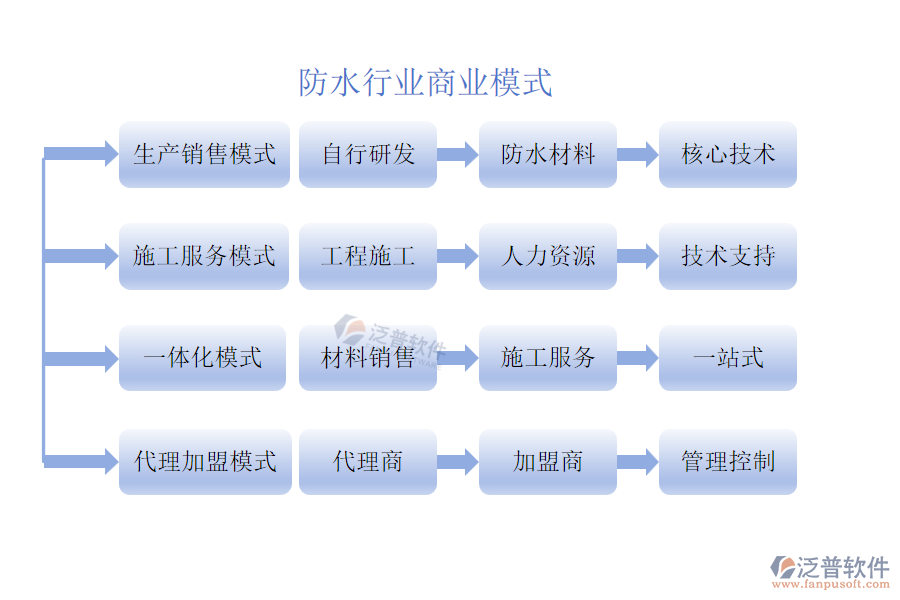 1.生產銷售模式:主要是防水企業(yè)自行研發(fā)和生產防水材料,然后通過銷售渠道將產品賣給客戶。能夠掌握產品的核心技術和品質,但需要投入大量的資金和精力進行研發(fā)和生產。