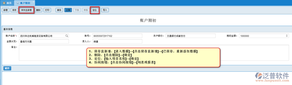 (2)、保存且新增:將當(dāng)前賬戶期初表單的數(shù)據(jù)錄入后,點(diǎn)擊保存且新增,系統(tǒng)就會(huì)同時(shí)保存已錄入的數(shù)據(jù)并轉(zhuǎn)到新的頁(yè)面,可以再次重新增加數(shù)據(jù)