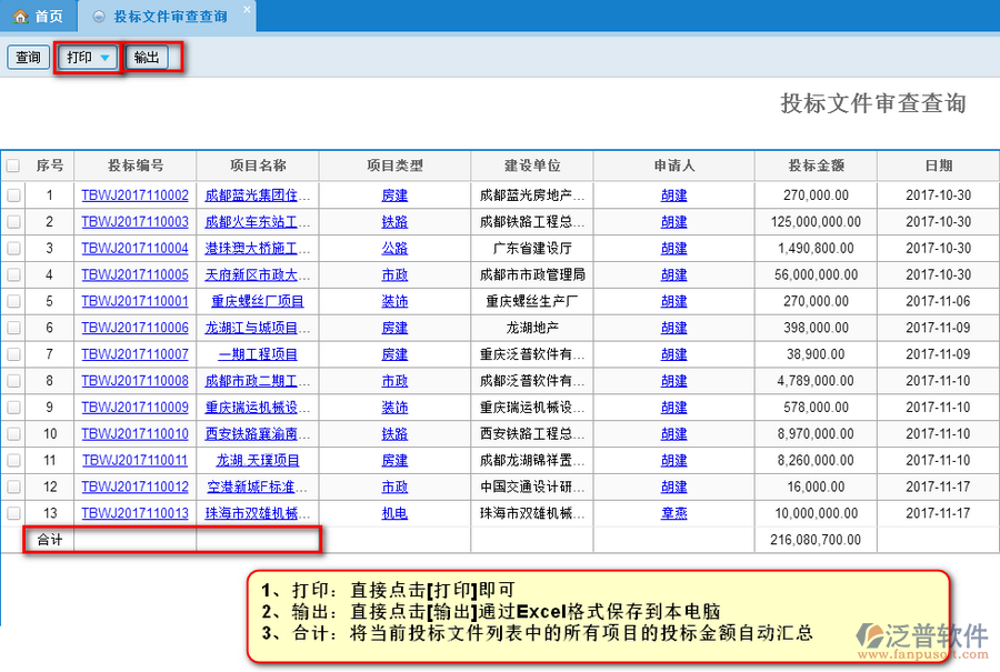 (4)、輸出:如果當前招標文件審查列表的模板不是自己想要的,可以點擊輸出通過Excel表格的格式保存到電腦,對列表進行第二次自定義的修改