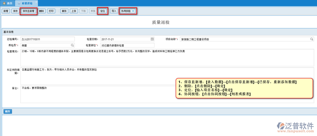 (1)、【錄入數(shù)據(jù)】→【保存】:錄入巡檢日期、項(xiàng)目名稱、巡檢人、檢查部位、檢查情況、糾正預(yù)防措施、備注以上信息,并上傳相關(guān)的附件
