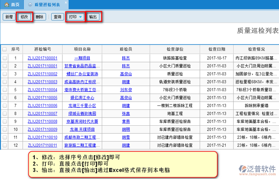 (5)、輸出:如果當前質(zhì)量巡檢列表的模板不是自己想要的,可以點擊輸出通過Excel表格的格式保存到電腦,對列表進行第二次自定義的修改