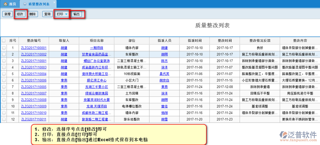 (5)、輸出:如果當(dāng)前質(zhì)量整改列表的模板不是自己想要的,可以點(diǎn)擊輸出通過Excel表格的格式保存到電腦,對列表進(jìn)行第二次自定義的修改