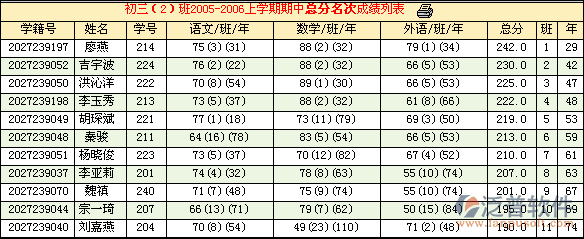 學生名次統(tǒng)計班級或全年級學生的各科和總分的班級和年級名次,可進行多種形式總分分析