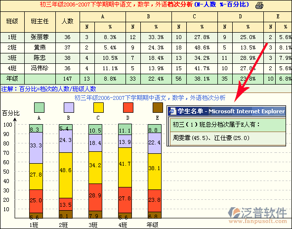 ?、偻卣狗治?mdash;群體檔次分析:分析各班級單科或多科總分各檔次的人數(shù)和百分比例,有利于教師根據(jù)班級內(nèi)部結構不同,制定不同的教學對策