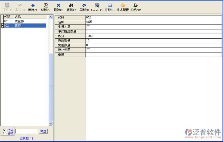 ?、?點擊【新增】按鈕,輸入代碼、名稱、選擇單次贈送數(shù)量、積分、投放數(shù)量、發(fā)放數(shù)量