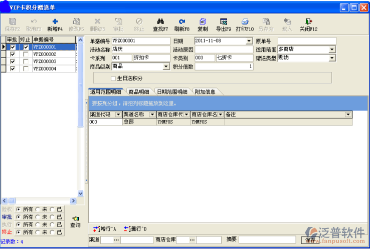 在泛普會員管理系統(tǒng)中,可以對我們的積分贈送單進行管理,了解客戶積分情況,對可以購買情況進行分析。會員卡的數(shù)量及信息我們可獨立保存,做數(shù)據(jù)分析,了解到哪些會員卡是贈送的哪些是客戶辦理的。