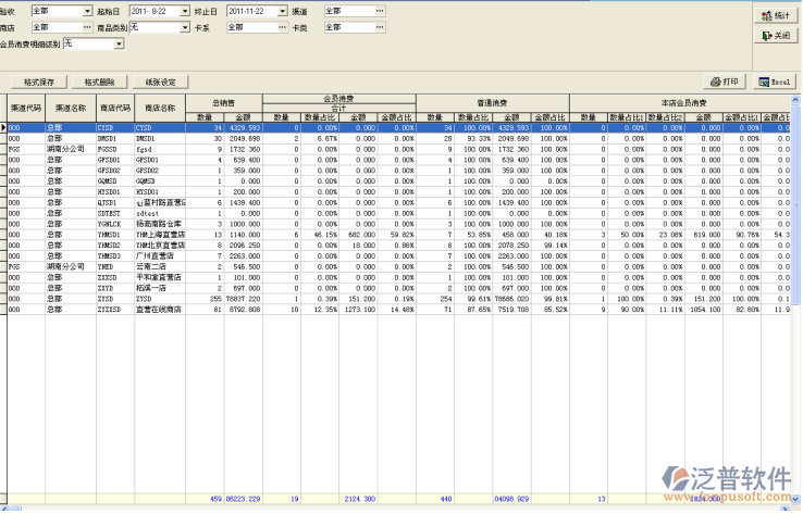 用于統(tǒng)計會員和普通消費(fèi)直接數(shù)據(jù)的對比,包括數(shù)量和金額。表頭可設(shè)置時間、商店、卡類等統(tǒng)計條件。