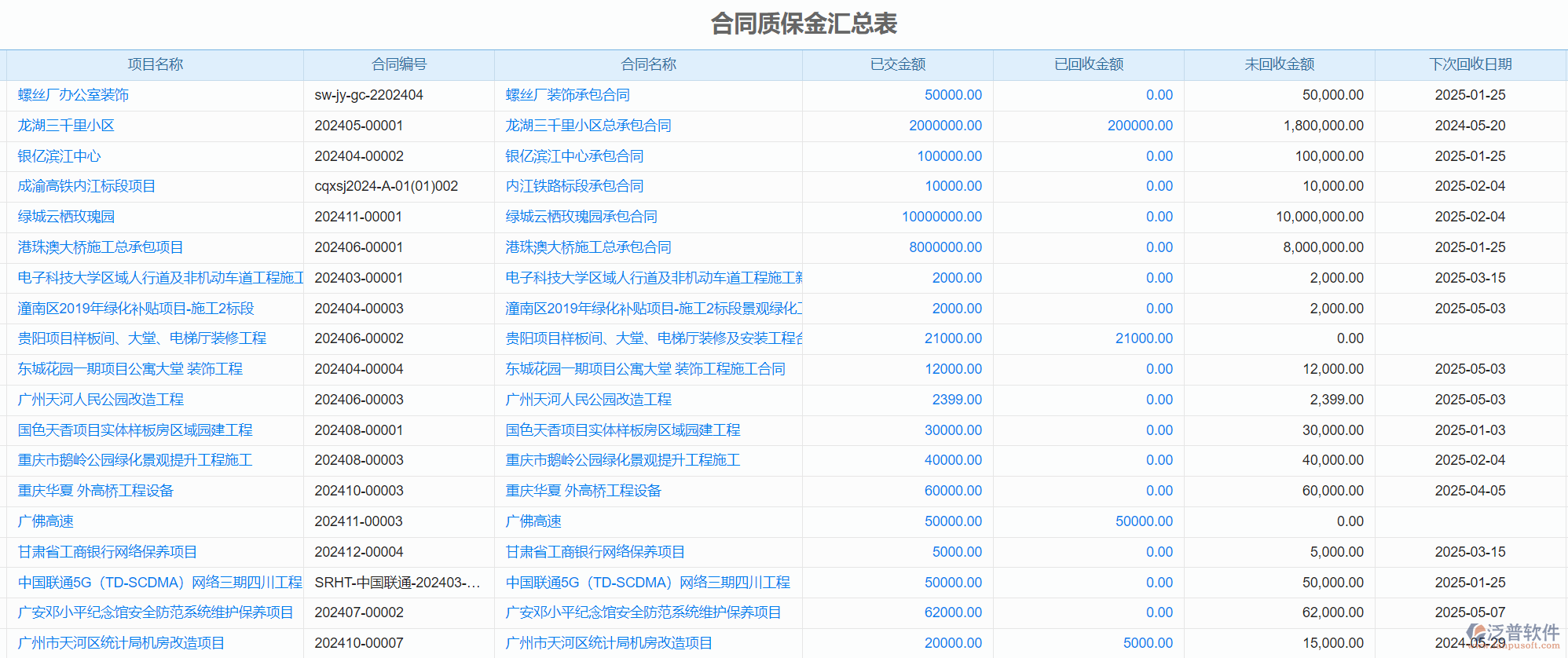合同質(zhì)保金匯總表: