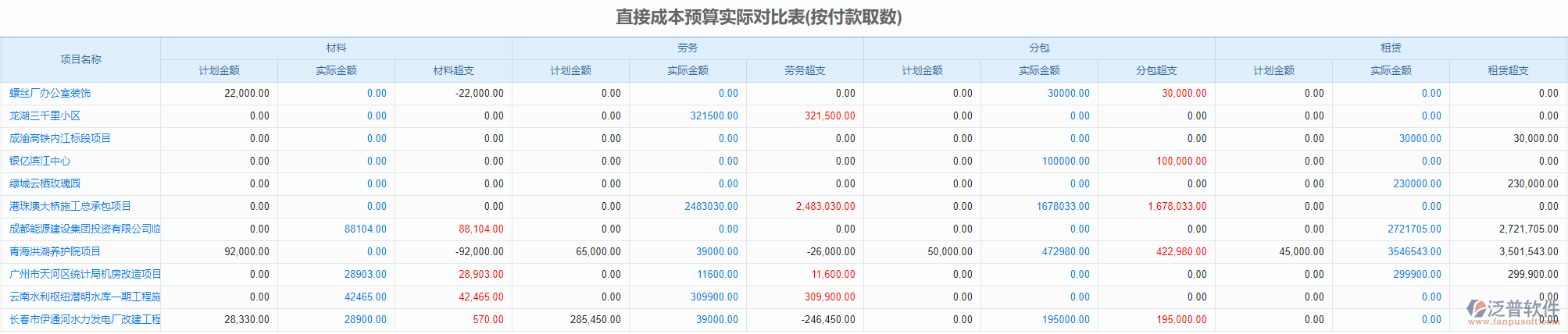 可根據(jù)項(xiàng)目名稱查詢?cè)擁?xiàng)目的直接成本預(yù)算和實(shí)際收入的對(duì)比,自動(dòng)計(jì)算出每一項(xiàng)的預(yù)算和實(shí)際的差額(報(bào)表上藍(lán)色字體可鏈接到原數(shù)據(jù)列表)