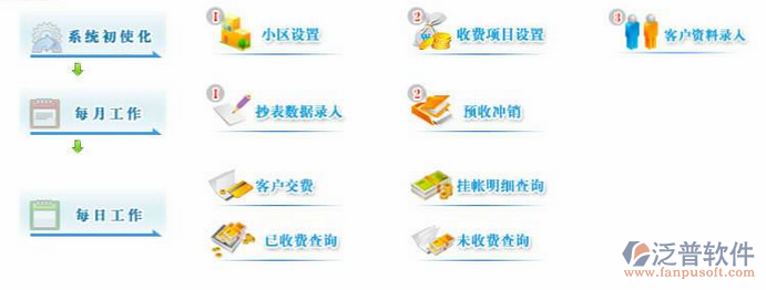 泛普物業(yè)管理軟件易看、易懂、易學(xué)、泛普。特別是泛普物業(yè)綜合管理軟件特色的業(yè)務(wù)導(dǎo)航圖功能,清晰地顯示出各種業(yè)務(wù)的操作流程。