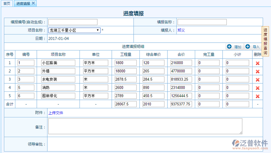 填寫填報(bào)名稱、項(xiàng)目名稱、日期、項(xiàng)目名稱、單位、工程量、綜合單價(jià)、合價(jià)、完工量等