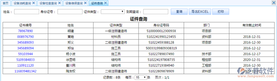可根據(jù)姓名、身份證號碼、證件類型查詢證件信息(報表上藍(lán)色字體可鏈接到原數(shù)據(jù)表單)