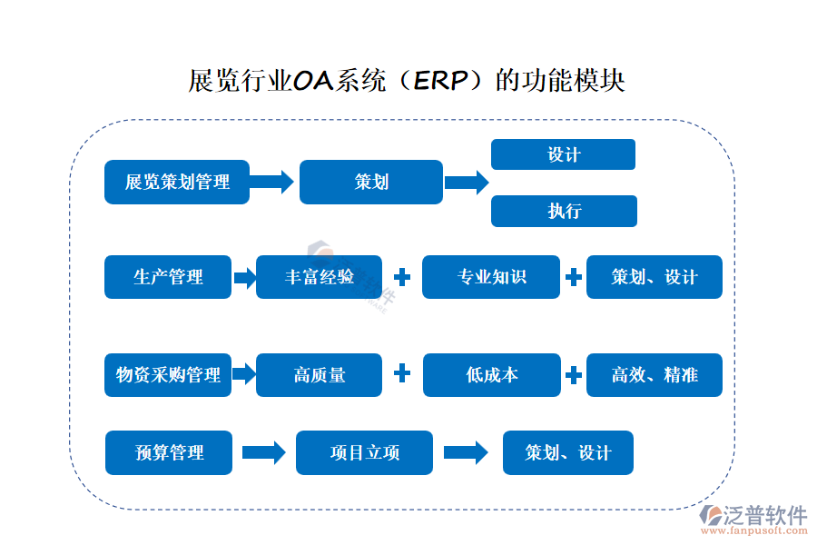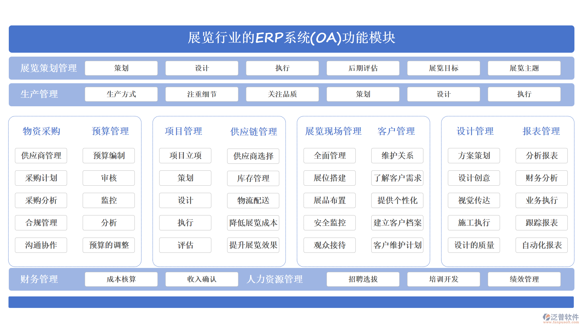 展覽行業(yè)OA系統(tǒng)(ERP)涵蓋會(huì)議、展覽、活動(dòng)策劃等多個(gè)領(lǐng)域,主要為客戶提供展位設(shè)計(jì)、搭建,展品運(yùn)輸,現(xiàn)場運(yùn)營等服務(wù)。以財(cái)務(wù)為核心,將項(xiàng)目管理貫穿整個(gè)系統(tǒng)的流程管理,通過概算、預(yù)算、結(jié)算來管控項(xiàng)目成本,用流程管理、知識(shí)管理體系進(jìn)行保障,全方位對項(xiàng)目成本進(jìn)行控制,并通過報(bào)表方式輔助管理人員決策。